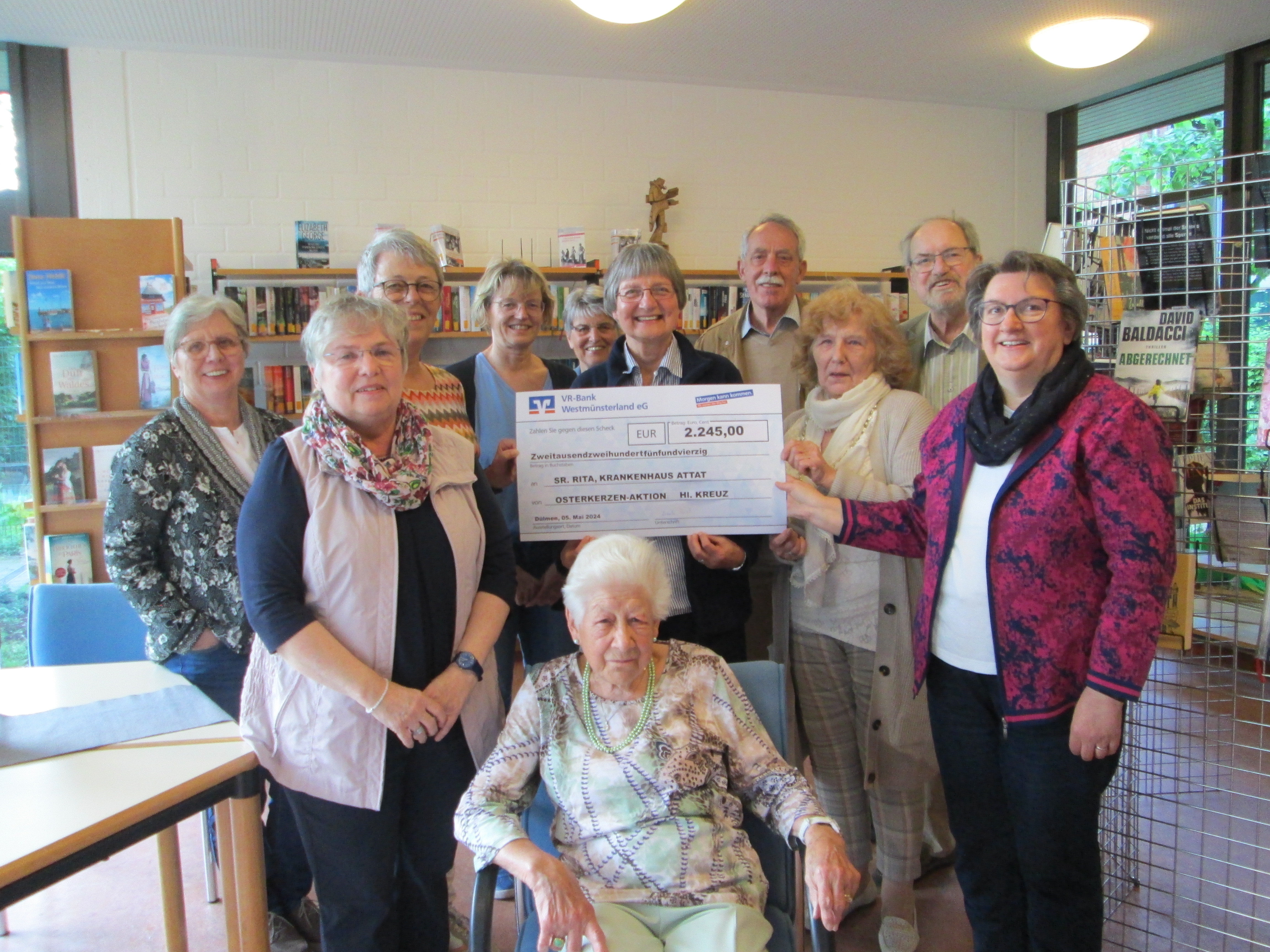 Am ersten Sonntag im Mai gab es für die Osterkerzen-Kreativgruppe der Gemeinde Hl. Kreuz ein sehr erfreuliches Ereignis. So konnten die Mitglieder das Geld, das sie durch die Gestaltung und den Verkauf der Haus-Osterkerzen erwirtschaftet hatten, persönlich dem Empfänger der erwirtschafteten Spende übergeben. Man hatte beschlossen, in diesem Jahr die Spende noch einmal dem christlich geprägten Krankenhaus in Attat (Äthiopien) zukommen zu lassen. Das Erfreuliche war, dass man die Spende dieses Mal der in Attat arbeitenden Ärztin Schwester Rita („Missionsärztliche Schwestern“) persönlich übergeben konnte.